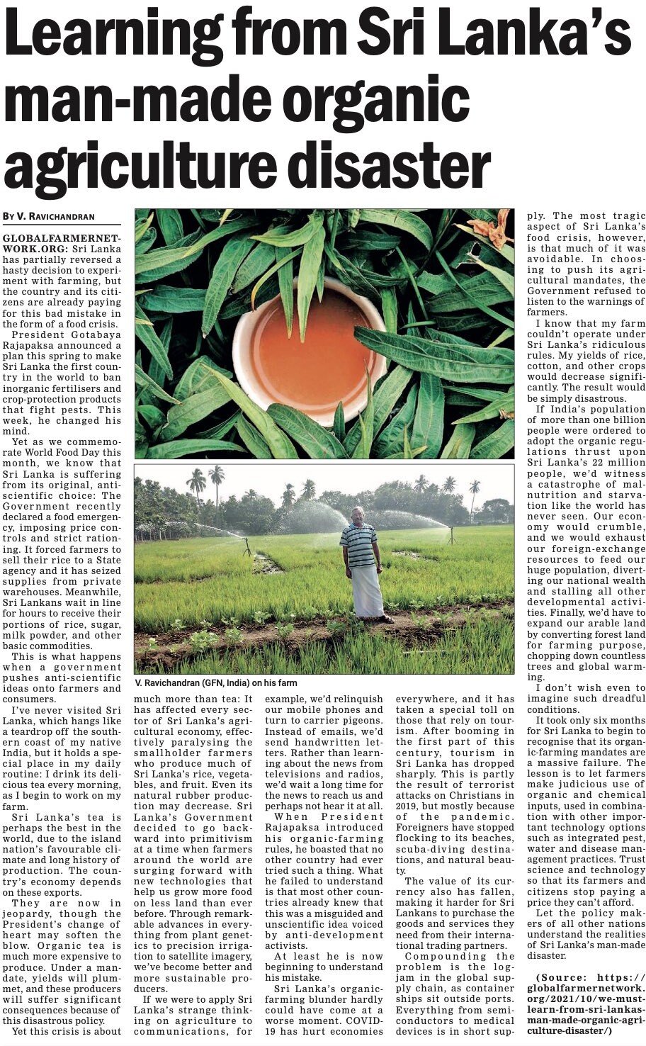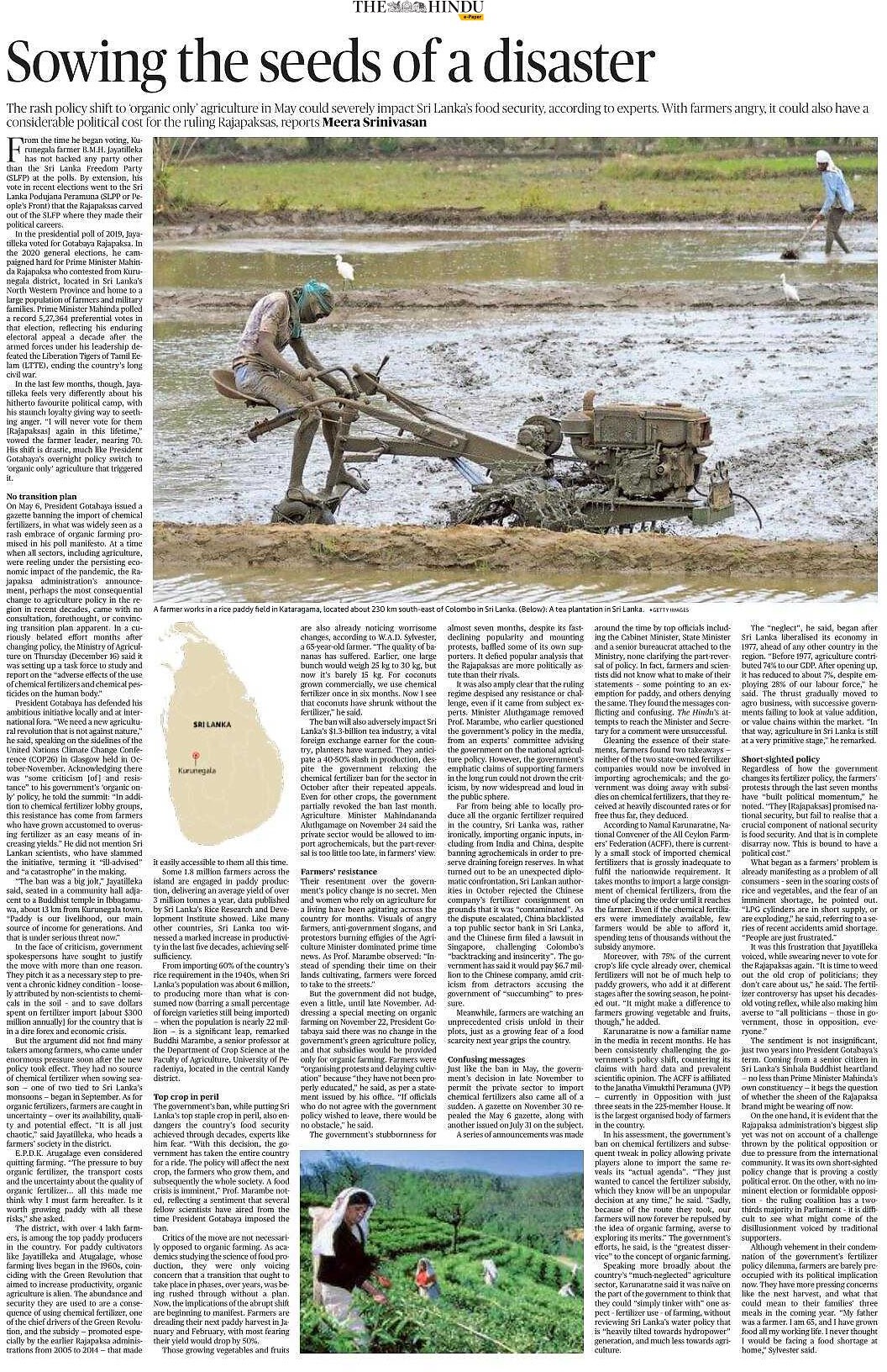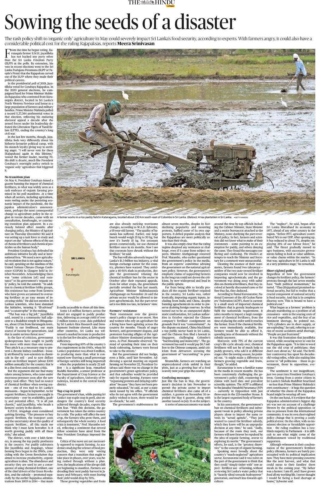 <q>Polityka Sri Lanki <q class="s">tylko ekologiczne</q> | Zasiewanie ziarna katastrofy</q> opublikowane w The Hindu przed katastrofą