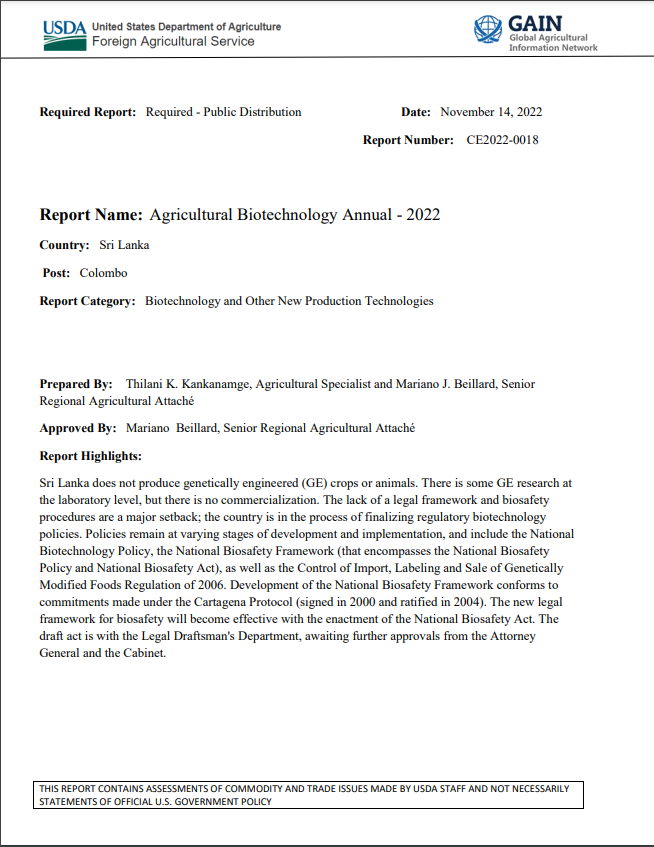 (2023) Raport USA potwierdza produkcję żywności GMO w Sri Lance Źródło: AgricultureInformation.lk | Dokument Departamentu Rolnictwa Stanów Zjednoczonych